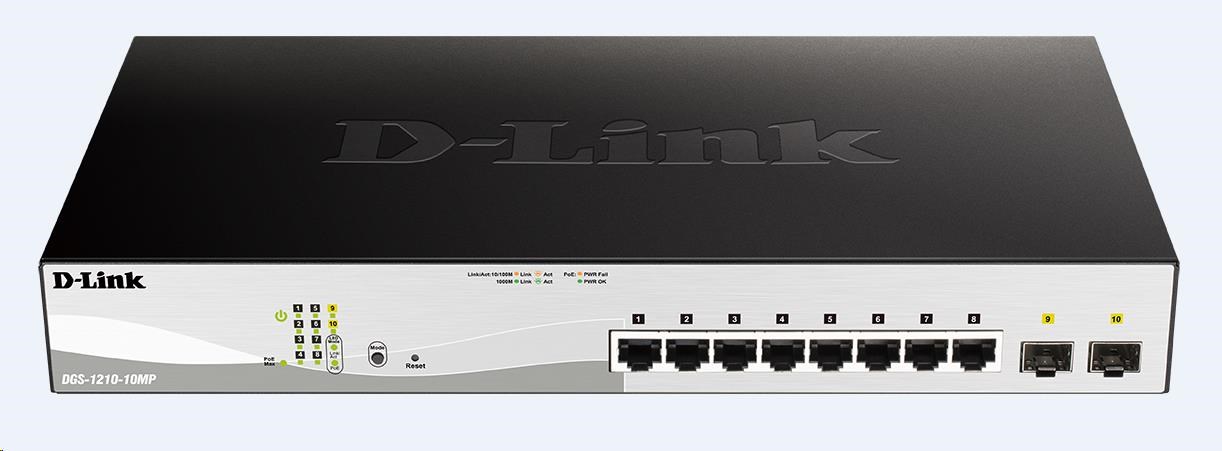 D-Link DGS-1210-10MP 10port Gb Smart sw, PoE 130W D-Link DGS-1210-10MP je 10-portový PoE+ Gigabit Ehernet L2/L3 Smart Managed switch bez větráků, vhodný pro podnikové sítě (SMB) a kamerové systémy. Je osazený 8 porty 10/100/1000M RJ-45 s podporou napájení 802.3af/802.3at PoE+ (max. 30W) a dvěma 100/1000M SFP sloty s podporou 100M SFP a Gigabit SFP transceiverů. Celkový PoE výkon přepínače je 130W. Napájení přepínače je 230V AC, součástí dodávky jsou držáky pro montáž do 19“ rozvaděče. Kromě pokročilé sady L2 funkcí, VLAN, QoS, AAA, ACL a bezpečnostních funkcí je podporovaný také L3 statický routing (max. 4 IP Interface, 124/50 IPv4/IPv6 záznamů). Funkce Voice VLAN detektuje připojení IP telefonů a přiřazuje je automaticky do samostatné VLAN s vyšší prioritou. Unikátní Surveillance režim umožňuje pomocí LLDP a ONVIF detekovat prvky kamerových systémů (IP kamery, NVR) a automaticky je přiřadit do oddělené video-VLAN. Ve webovém rozhraní přepínače lze zobrazit i topologii sítě. Výrazně se tak zjednodušuje a urychluje nasazení a správa firemní sítě a IP kamerových systémů. Správa přepínače je z intuitivního webového rozhraní nebo pomocí SNMP příkazů. K dispozici je také bezplatná utilita D-Link Network Assistant (DNA) a centrální NMS plaforma D-View7. Kompaktní sada Telnet CLI příkazů umožňuje základní nastavení přepínače (nastavení IP adresy, hesla, reset, reboot, ping, upgrade FW, nahrání/zálohování konfigurace, show, debug). Specification: Interfaces: 8x 10/100/1000 Base-T PoE+ (802.3at) and 2x 100/1000 Mbps SFP ports PoE capable ports: ports 1 to 8, IEEE 802.3af PoE / 802.3at PoE+ (max. 30W) PoE power budget: 130W Port standards: - IEEE 802.3 10BASE-T Ethernet (twisted-pair copper) - IEEE 802.3u 100BASE-TX Fast Ethernet (twisted-pair copper) - IEEE 802.3u 100BASE-FX 100 Mbps over fiber optic - IEEE 802.3ab 1000BASE-T Gigabit Ethernet (twisted- pair copper) - IEEE 802.3z 1000BASE-X 1 Gbps over fiber optic - IEEE 802.3az Energy Efficient Ethernet (EEE) - IEEE 802.3x Flow Control Duplex Mode: - Full/Half-duplex for 10/100 Mbps - Full-duplex for 1000 Mbps Media Interface Exchange: Auto MDI/MDIX adjustment for all twisted-pair ports Switching Capacity: 20 Gbps MAC Address table: 8K entries Static MAC Addresses : 256 entries Maximum 64 Byte Forwarding Rate: 14,88 Mpps Packet Buffer Memory: 4,1 Mbits CPU Memory: DDR3 128 MB Flash Memory: 32 MB Internal Power Supply 100 to 240V AC Maximum Power Consumption: 9,4W/240V (without PoE) Standby Power Consumption: 5,2W / 240V Acoustics: 0 dB (fanless) Heat Dissipaion: 507.23 BTU/hr (240V) Operating Temperature: -5 to 50°C Storage Temperature: -20 to 70°C Operating / Storage Humidity: 0% to 95% relative humidity Dimensions (L x W x H): 330 x 180 x 44 mm Installation: Desktop / 19“ Rack Mount (mounting brackets included) Weight: 1,77 kg MTBF: 1,274,005hours L2 Features: MAC Address Table: 8K entries IGMP Snooping - IGMP v1/v2 Snooping - IGMP v3 awareness - Supports 256 IGMP groups - Supports at least 64 static multicast addresses - IGMP per VLAN - Supports IGMP Snooping Querier MLD snooping v1/v2 (256 groups) Loopback Detection 802.3ad Link Aggregation: Maximum of 8 groups/8 ports per group LLDP / LLDP-MED Jumbo Frame: Up to 10,000 bytes Spanning Tree Protocol: 802.1D STP, 802.1W RSTP, 802.1s MSTP Flow Control: 802.3x Flow Control, HOL Blocking Prevention Port Mirroring: One-to-One, Many-to-One, Supports Mirroring for Tx/Rx/Both Multicast Filtering: Forwards all unregistered groups, Filters all unregistered groups Configurable MDI/MDIX VLAN: 802.1Q VLAN Group: Max. 256 static VLAN groups Configurable VID from 1 - 4094 Asymmetric VLAN Auto Voice VLAN: Max. 10 user-defined OUI, Max. 8 default OUI Auto Surveillance VLAN Quality of Services (QoS): 802.1p Quality of Service 8 queues per port Queue Handling: Strict, Weighted Round Robin (WRR) Bandwidth Control: Port-based (ingress/egress, min granularity 10/100/1000 is 16 Kbps) QoS based on: - 802.1p priority queues - DSCP - MAC address - EtherType - IP address - Protocol type - ToS - IP preference - IPv6 Traffic Class - TCP/UDP port L3 Features: IP interface: Supports 4 interfaces IPv6 Neighbor Discovery (ND) Static routing: 124 IPv4 static route entries, 50 IPv6 static route entries Access Control List (ACL): Max. 50 access lists Max. 768 rules shared by IPv4, MAC, and IPv6 Each rule can only be associated with a single port ACL based on - MAC address o 802.1p priority mask o VID mask o Source/destination MAC address mask o EtherType mask - IP address o Source/destination IP address mask o DSCP mask o Protocol type mask o TCP/UDP port number mask - IPv6 address o Source/destination IP address mask o DSCP mask o Protocol type mask o TCP/UDP port number mask o IPv6 traffic class mask Security: Broadcast/Multicast/Unicast Storm Control D-Link Safeguard Engine Traffic segmentation SSH v2 TLS v1.0 DoS attack prevention 802.1X Port-based Access Control Port Security: Supports up to 64 MAC addresses per port ARP Spoofing Prevention: Max. 127 entries DHCP Server Screening IP-MAC-Port Binding (Smart Binding) - ARP Inspection: Max. 256 entries - IPv4 Inspection: Max. 127 entries - IPv6 Inspection: Max. 63 entries - DHCP Snooping: Max. 512 entries AAA 802.1X Authentication: Supports local/RADIUS database Supports port-based access control Supports EAP, OTP, TLS, TTLS, PEAP Max. 128 entries when using local database IPv6 RADIUS server Support MD5 authentication OAM Cable Diagnostics Factory Reset Management: Web-based GUI D-Link Network Assistant Utility Compact CLI Telnet Server TFTP Client Configurable MDI/MDIX SNMP Supports v1/v2c/v3 SNMP Trap Backup/upgrade firmware Smart Wizard Upload/download configuration file BootP/DHCP Client System Log: Max. 500 log entries SNTP ICMP v6 IPv4/v6 Dual Stack DHCP Auto Configuration Time setting RMONv1 Trusted host Dual image Dual configuration Green V3.0 T