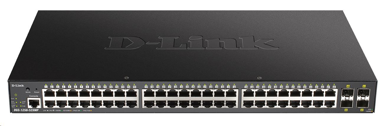 D-Link DGS-1250-52XMP Smart switch 48x Gb PoE+, 4x 1G/10G SFP+, 370W D-Link DGS-1250-52XMP je L2/L3 Gigabit Smart Managed switch osazený 24 porty 10/100/1000Base-T RJ-45 s podporou napájení 802.3at PoE+ (max. 30W na port) a 4 dvourychlostními 1G/10G SFP+ porty pro uplink nebo pro připojení serverů, s podporou Gigabit SFP a 10G SFP+ transceiverů. Celkový PoE výkon switche je 370W. Série DGS-1250 disponuje komplexní sadou L2 funkcí (např. VLAN, detekce smyček, agregace linek, zrcadlení portů, Spanning Tree protokoly STP/RSTP/MSTP, IGMP/MLD Snooping atd.) a L3 statickým routingem (4 IP interfaces, max. 124/50 IPv4/IPv6 statických záznamů v tabulce). Bezpečnostní funkce (ACL, 802.1x, MAC Security, IP-MAC-Port binding atd.) a funkce řízení kvality služeb QoS zajišťují spolehlivý provoz sítě). Správa přepínače je přes webové rozhraní nebo pomocí SNMP příkazů. Pro kamerové systémy je určen Surveillance Mode režim webového rozhraní a funkce Auto-Surveillance VLAN pro automatické přiřazení prvků kamerových systémů do oddělené VLAN s vyšší prioritou. Pro centrální správu sítě je k dispozici bezplatný SW nástroj D-Link Network Assistant (DNA) a pokročilá platforma D-View7. Série DGS-1250 je cenově efektivní 10G řešení jako páteřní switche pro malé a střední firmy (SMB) nebo jako přístupové switche v podnikových (Enterprise) sítích. Na switche DGS-1250 je záruka 5 let. Při registraci výrobku do Samoobslužného portálu (na www.dlink.com, sekce "Podpora" -> "Potřebujete pomoc?") do 30 dnů od zakoupení pak výrobce poskytuje tzv. omezenou doživotní záruku, která končí 5 let po ukončení prodeje. Po dobu záruky je v ceně také NBD služba pro odeslání náhradní jednotky následující pracovní den, požadavek se zadává přes uvedený Samoobslužný portál. 48-port Gigabit Smart Managed Switch with 4x 10G SFP+ ports, 370Watts - 48 x 10/100/1000Mbps PoE Auto-Negotiating Ports - 4 x SFP+ Ports - PoE power budget 370W with 15.4W per port - Static route - Auto Surveillance VLAN - Auto Voice VLAN - Dual images - Dual configuration files - Switching Capacity 176 Gbps - Max power consumption 443.6W (PoE On), 57.2W (PoE Off) - Half-/Full-Duplex, auto-negotiation, Auto MDI/MDIX - IEEE 802.3x Flow Control - 802.3ad Link Aggregation - Asymmetric VLAN - 802.1p priority queues - MAC/IP-based ACL - 802.1X port-base Access Control, Port Security - LLDP, LLDP-MED, Smart Binding, Traffic Segmentation - D-Link Safeguard Engine - Web based management, compact CLI - D-View 7.0 support - 440 x 430 x 44 mm - 3.85 kg
