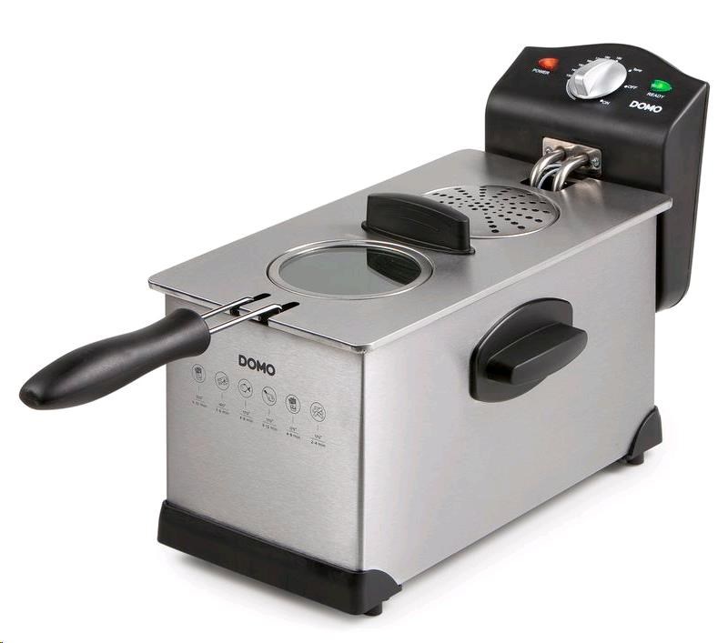 Celenorezová fritéza značky DOMO, která je vybavená dvojitým vnější pláštěm, který tak zabraňuje popálení v čase fritování i po něm.