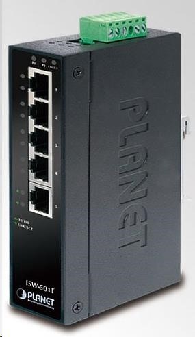 Planet ISW-501T, 5x 10/100, DIN,IP30, rozšířený teplotní rozsah -40~75 st.C Přepínače pro průmyslový Ethernet jsou určeny do náročných provozních podmínek s velkým rozsahem pracovních teplot, nejistým napájením a častými otřesy. Přepínače řady ISW se snadno instalují na standardní DIN lištu nebo přímo na zeď a umožňují nasazení dobře známé Ethernetové technologie i v průmyslovém prostředí. Stejně tak jsou vhodné pro instalace do venkovně umístěných skříní s velkým kolísáním pracovních teplot (typicky bezdrátové a MAN ISP aplikace). Vlastnosti: 5 portů 100 Base-TX, Switching, Full Duplex (100/200 Mbps), Auto-Negotiation (10/100 Mbps) 2k MAC adres automatická detekce přímý/křížený kabel na každém portu pole LED indikátorů pro diagnostiku provozu instalace na DIN lištu, montážní díl součástí instalace na zeď, montážní díl součástí krytí IP30, skříň celohliníková napájení: 12-48V DC redundantní, připojení možné ze dvou různých zdrojů (nejsou součástí balení) ochrana proti přepólování, připojení napájení na svorkovnici, umístění na spodním panelu (nepřekáží při montáži na zeď) zařízení je odolné proti pádu (IEC-60068-2-32) z výšky 75cm na všechny dopadové části zařízení je odolné proti vibracím (IEC-60068-2-6) 10-500-10Hz, 4x g, 0,5oct/min zařízení je odolné proti přetížení krátkodobému zrychlení 50x g, dlouhodobému 4x g (IEC-60068-2-27) EMI/EMS, elektromagnetická kompatibilita a slučitelnost dle CE EN-6100-4-2,3,4,5,6 elektrická bezpečnost dle CE EN-60950 pracovní teplota -40 až 75 st. C, vlhkost do 90% příkon 11W hmotnost: 438g rozměry: 135 x 87 x 32 mm