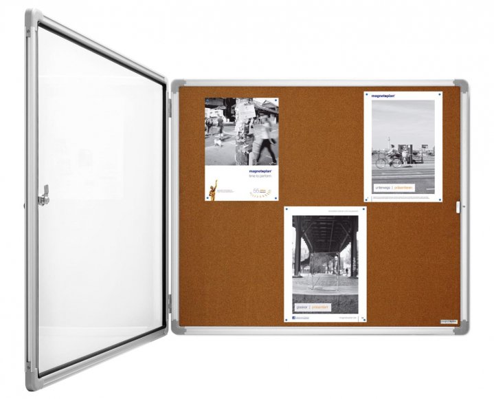 Vitrína Magnetoplan pro vnitřní prostory. Vnitřní čelní stěna lisovaný korek – velikostně optimální pro umístění 4× A4 formátu. Prosklená dvířka, zámek s dvěma klíči, zadní stěna kovová pozinkovaná. Po obvodu zakulacený hliníkový profil, v rozích spojený šedým plastovým dílem. Dodáváno s montážním materiálem. Rozměry: Venkovní (š x v x h): 610×730×40 mm Vnitřní bílá plocha (š x v): 540×660 mm Vniřní/celková hloubka: 15/40 mm