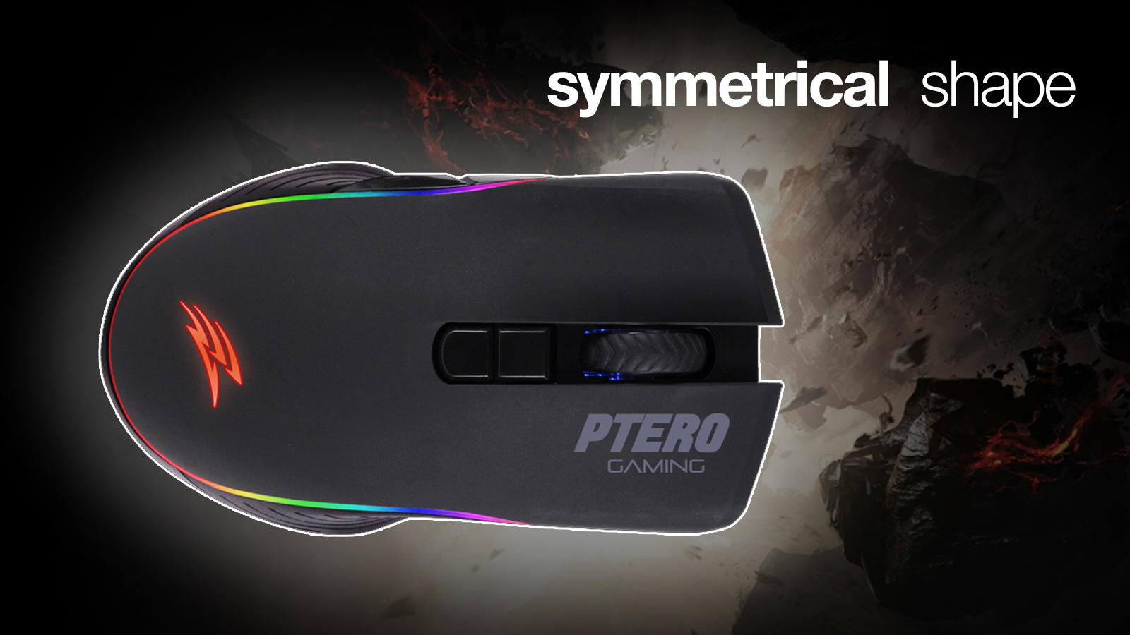 Symetrický design vhodný pro praváky i leváky. Díky SW kde si můžete nastavit funkce jednotlivých tlačítek, takže může myš pohodlně ovládat i levák. Ergonomie myši zaručuje komfort při dlouhodobém ovládání.