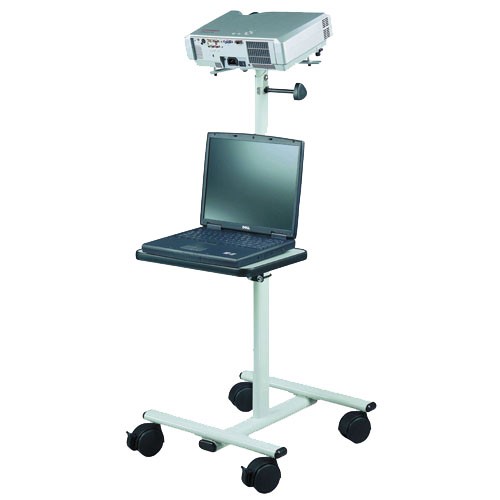 Stolek pod dataprojektory s nastavitelnou výškou 70-110cm na kolečkách. Univerzální uchycení dataprojektorů s možností naklápění +5°-20° / nosnost do 25kg. Odkládací deska 40x30cm / nosnost 5kg , celková hmotnost 8kg, barva bílá).