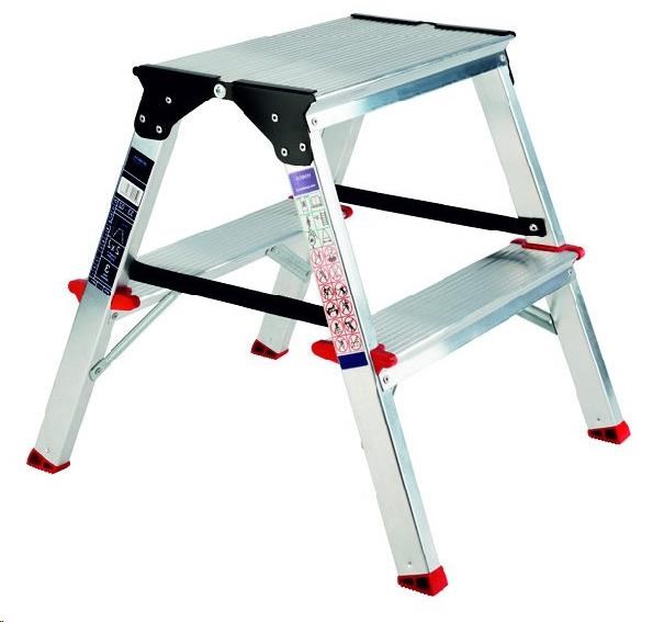 Oboustranné hliníkové schůdky 2x2 (2+2) jsou lehké a skladné. Schůdky jsou ideálním pomocníkem a najdou široké uplatnění v každé domácnosti, na chatě či chalupě nebo v obchodu popř. kanceláři. Ať už potřebujete umýt okna, vyměnit žárovku nebo uložit věci do vysokých skříní - schůdky Venbos jsou vždy připraveny k rychlému použití. A když je nebudete potřebovat, jednoduše je složíte a schováte je do komory, za skříň nebo pod postel. Schůdky mají nahoře praktickou rovnou plochu. Schůdky jsou vyráběny s důrazem na vysokou kvalitu a bezpečnost. Schůdky Vám tak vydrží dlouhá léta. Bezpečnost pohybu po schůdcích zvyšuje protiskluzové rýhování nášlapů. Rýhované příčle o šířce 8 cm se širokou nášlapnou plochou. Bezpečnou stabilitu schůdků zajišťují kvalitní protiskluzové patky, které zároveň brání poškození povrchu, na němž jsou schůdky použity. Technické parametry: Model: 3302 EAN: 3871880001398 NORMA: evropská norma EN131-2 Výška složených schůdků: 485mm Výška schůdků: 420mm Pracovní výška schůdků: 2420mm Šířka schůdků: 408mm Rozestup mezi stupadly: 235mm Rozměr stupadla: 80mm Rozměr taženého profilu: 35 x 20 x 1,2mm