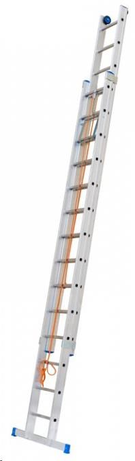 Dvoudílný výsuvný profesionální žebřík 2x22 EXPERT s lanem je vyroben z kvalitního odlehčeného hliníku. Díky lisovanému spojení příček s bočnicemi je zajištěná vysoká tuhost a životnost žebříku. Bezpečnost pohybu po žebříku zvyšuje protiskluzové rýhování nášlapů. Bezpečnou stabilitu žebříku zajišťují kvalitní protiskluzové patky, které zároveň brání poškození povrchu, na němž je žebřík použit. Technické parametry: Model: 4922 EAN: 3871880001718 NORMA: evropská norma EN131-2 Výška zasunutého žebříku: 6230mm Výška vysunutého žebříku: 10320mm Pracovní výška žebříku: 11220mm Šířka žebříku: 480mm Šířka stabilizátoru základny: 1200mm Rozestup mezi stupadly: 280mm Rozměr stupadla: 30 x 30mm Tloušťka profilu: 1,27mm Rozměr taženého profilu: 100 x 25 x 1,3mm